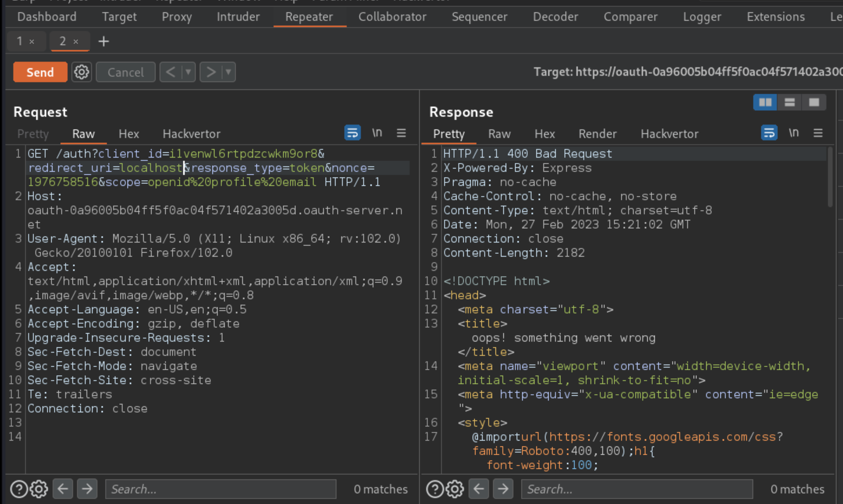 1. Log in with wiener:peter. Study the OAuth flow while proxying traffic through Burp. Using the same method as in the previous lab, identify that the redirect_uri is vulnerable to directory traversal. This enables you to redirect access tokens to arbitrary pages on the blog website.