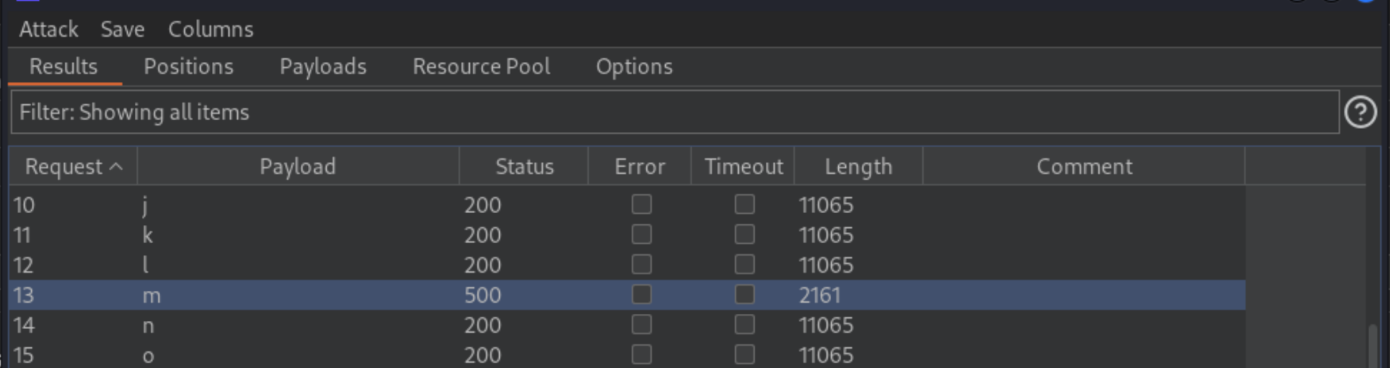 500status code when the error occurs, and an HTTP200status code normally. The “Status” column in the Intruder results shows the HTTP status code, so you can easily find the row with500in this column. The payload showing for that row is the value of the character at the first position.