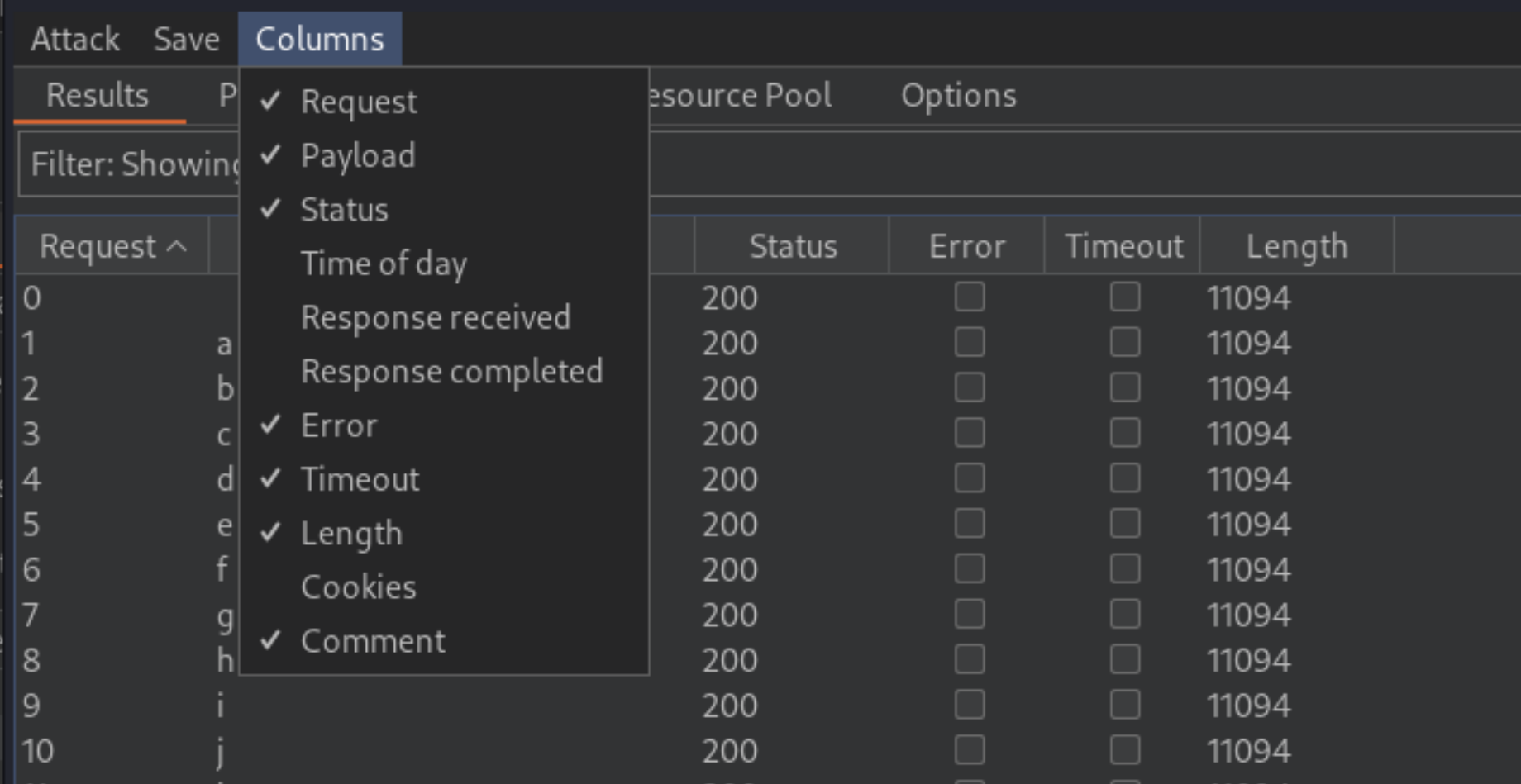 To be able to tell when the correct character was submitted, monitor the time taken for the application to respond to each request: Configure the Intruder attack to issue requests in a single thread: Go to the “Resource pool” tab and add the attack to a resource pool with the “Maximum concurrent requests” set to 1.