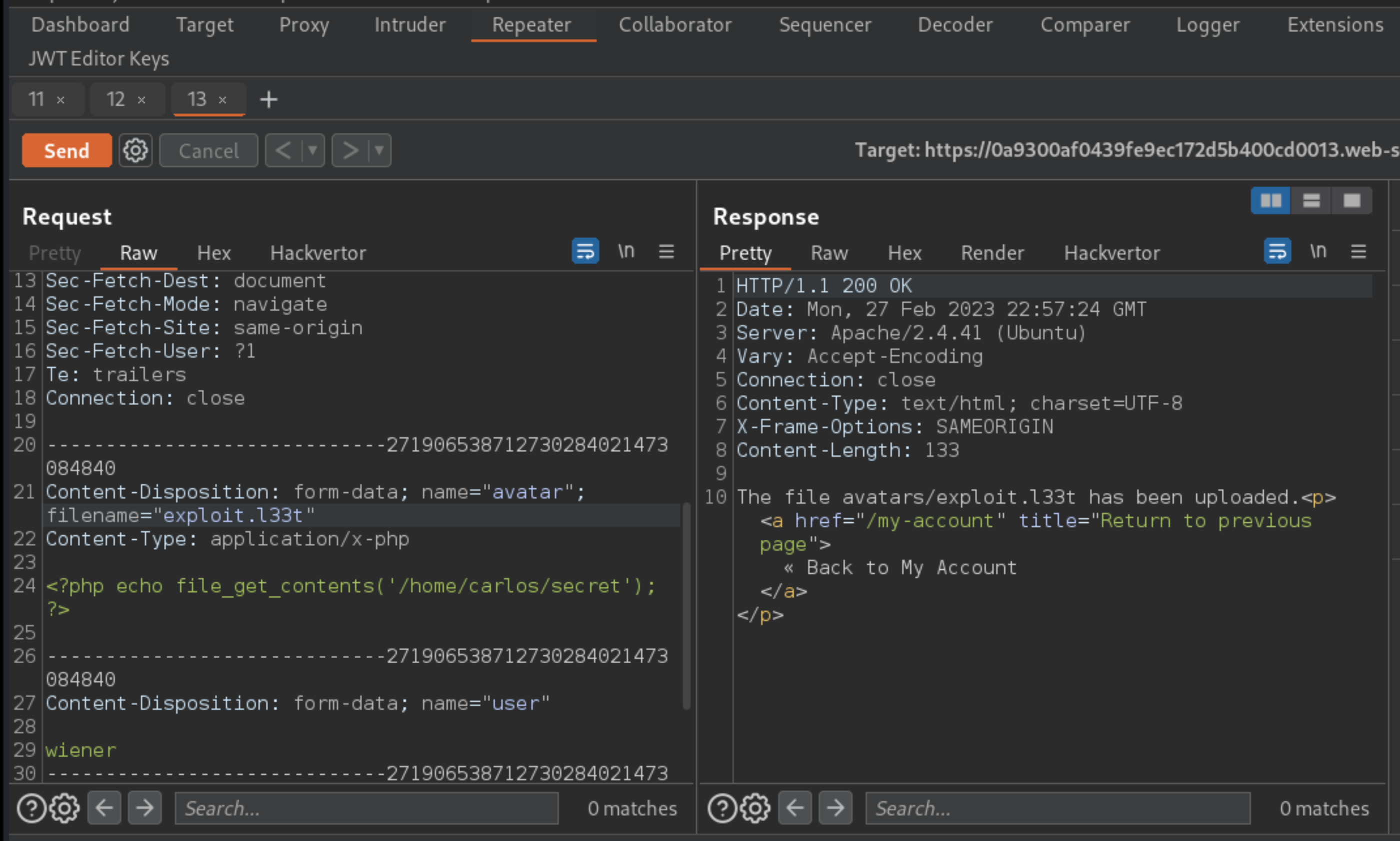 Carlos’s secret was returned in the response. Thanks to the malicious .htaccess file, the .l33t file was executed as if it were a .php file.