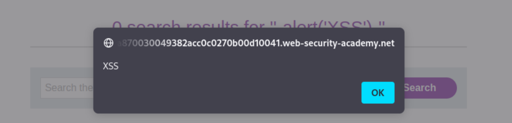 searchTerms, and does adocument.writewith the encoded URL usingencodeURIComponent.Replace the input with this payload to break out of the JavaScript string and inject an alert:
