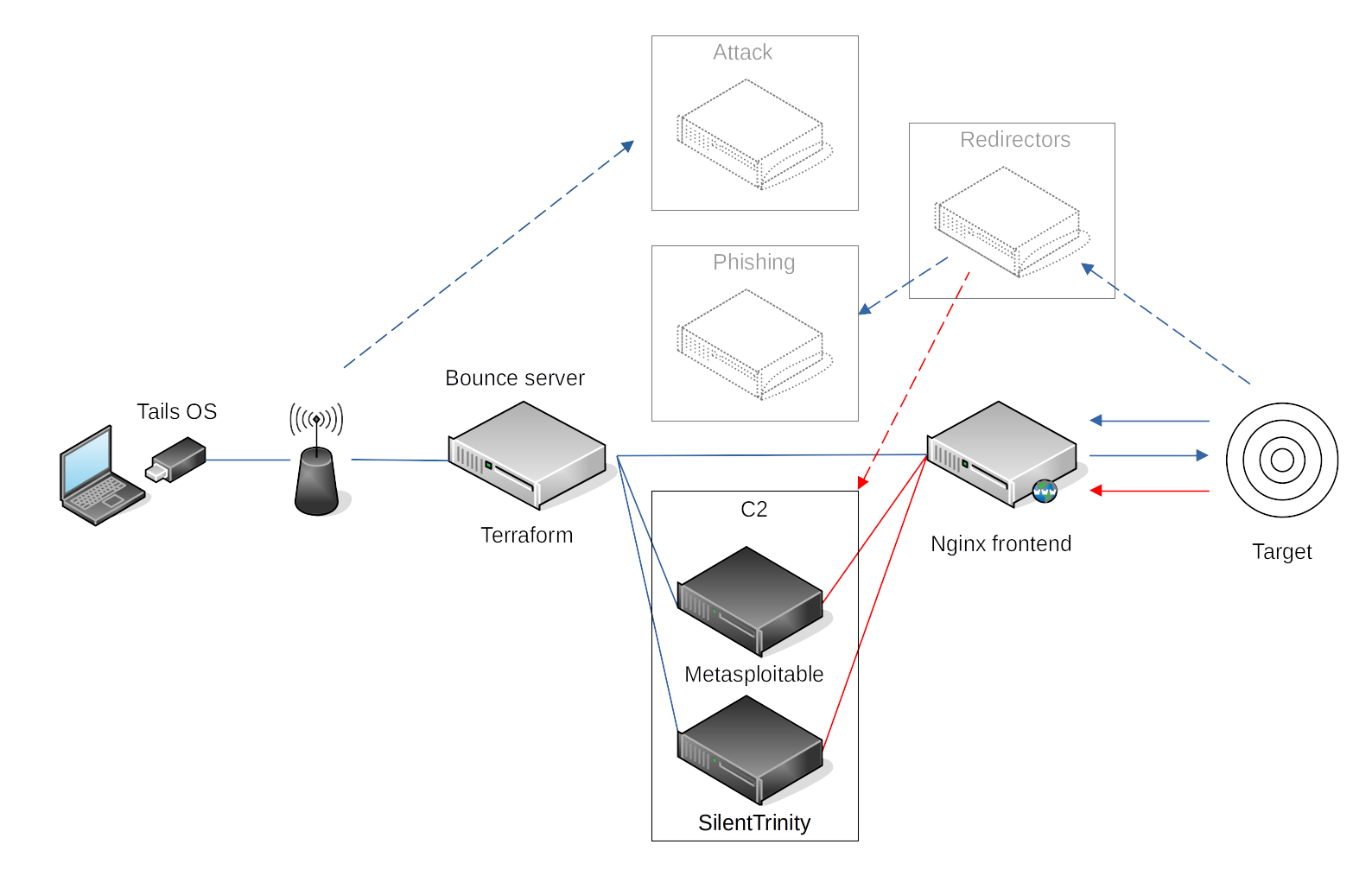We have to pretend to be adversaries that do not wish to be detected no matter what. Redirectors can be used to proxy requests coming from the target back to our attack infrastructure.